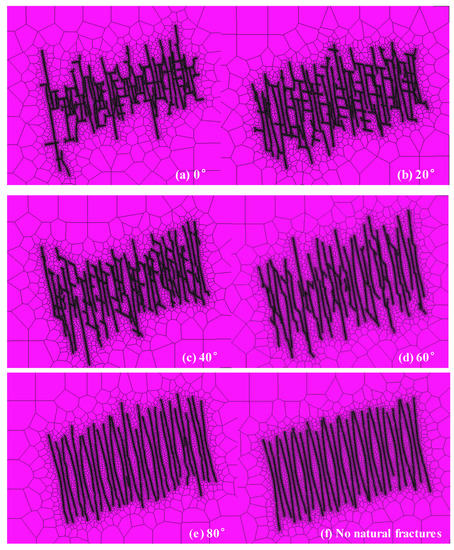 Natural fractures are an important factor in the complexity of the hydraulic fracture network [,,,,,,,,]. Based on the optimal fluid volume of 9600 m3 and the optimal shut-in time of 90 days, the natural fracture angle was changed to simulate well shut-in.