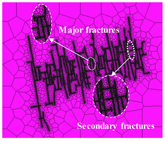(1) Grid division. The fracture extension simulation results are displayed in the grid, and the reservoir matrix pore pressure changes can be observed in the grid when simulating shut-in well. Figure 11 shows the fracture grid in both cases of no natural fracture and 0° natural fracture. The purple area in the figure represents the reservoir matrix and the thick black line represents the fracture network of the reservoir.