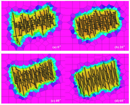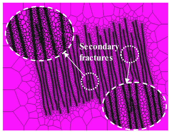 The fracture network formed by hydraulic fracturing at different natural fracture angles is shown in Figure 26. Take the example of Figure 27 when the natural fracture angle is 0° (partial enlargement of Figure 26a). A large number of second fractures with a relatively short length and nearly uniform angle are formed by the main fractures communicating with natural fractures during the expansion. The second fractures reduce the length of the main fractures, but make the network more complex. The complexity of the fracture network changes as the angle of the natural fractures changes. As can be seen from Figure 26, the larger the natural fractures angle, the fewer natural fractures are communicated, the longer the main fracture length and the less complex the fracture network. When the natural fractures angle increases to 80°, as shown in Figure 28 (partial enlargement of Figure 26e), only a small number of natural fractures are communicated during hydraulic fracturing and a simple fracture network is formed.