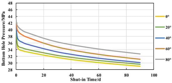 The variation in bottom hole pressure at different natural fracture angles is shown in Figure 31. It can be seen that the smaller the natural fracture angle and the more complex the fracture network, the more rapid the flow of fracturing fluid and the greater the decline in bottom hole pressure at the early stage of shutting in well. As the fracturing fluid gradually diffuses into the reservoir matrix, the rate of bottom hole pressure reduction slowed. The minimum bottom hole pressure of the fracture network formed by the 0° natural fracture at the end of shutting in well was 29.0 MPa.