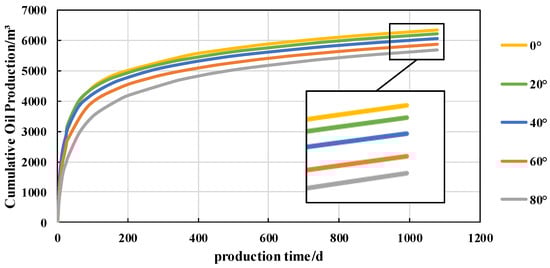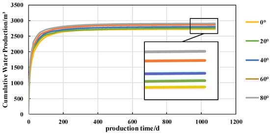The changes in cumulative oil production and cumulative water production under different natural fracture angles are shown in Figure 32 and Figure 33. It can be seen that the cumulative production under each natural fracture angle shows a trend of rapid increase at the early stage and a slowdown increase at the later stage. The smaller the natural fracture angle is, the more oil is produced cumulatively and the less water is produced cumulatively after shutting in well. Compared with the natural fracture angle of 80°, the 0° natural fracture increases oil production by about 600 m3, and compared with no natural fracture, the oil production increases by about 900 m3 after shutting in well. This indicates that natural fractures can improve the shut-in effect.