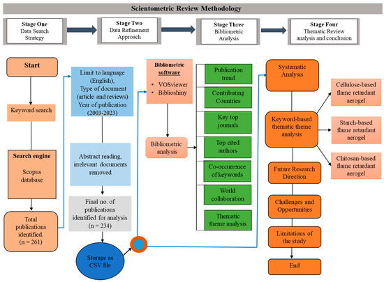 Compared to Web of Science (WoS), Scopus has wider bibliometric coverage and more recent data [32,33]. For several reasons, Scopus is more effective for carrying out daily research tasks and assessing research findings. First, Scopus offers more comprehensive coverage of content. Secondly, Scopus is easier to use because of the availability of personalized profiles for all authors, institutions, and serial sources as well as the connected database (DB) interface. Thirdly, the research analysis metrics and impact indicators are superior to the metrics offered by WoS [34,35], and also less prone to manipulation, and are accessible for all serial sources across all disciplines [35]. More crucially, Scopus is subscribed as a single DB, removing any ambiguity or extra limitations on the accessibility of the content [35]. Additionally, Scopus offers free access to authors and source information, including metrics, and it is more open to society [34,36]. Based on these obvious advantages, Scopus was used to compile bibliometric data for the current analysis of sustainable fire-resistant polysaccharide-based composite aerogels. The methodology used for this research is shown in Figure 1. The bibliometric data search in the Scopus database was conducted in June 2023.