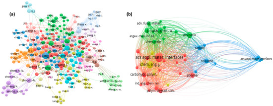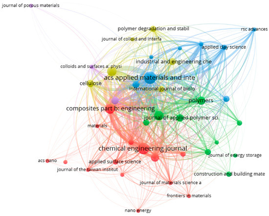 Additionally, a second analysis was conducted under the general theme “top cited co-authors”. Here, the “type of analysis” was set to “co-citation” and the “unit of analysis” to “cited sources” in the VOSviewer. A source’s minimum citation was set at 50 and 42 of the total 1901 sources met the criteria. The detailed quantitative data is provided in Table S2 whereas Figure 9 represents a visualization of the discussion in four clusters. Cluster 1 (red) has 17 items, cluster 2 (green) has 11 items, cluster 3 (blue) has 9 items and cluster 4 (yellow) has 5 items. The discussion concludes that the top five co-cited sources are ACS Appl. Mater. Interfaces with 536 citations, Chem. Eng. J. with 330 citations, ACS Nano in third place with 246 citations, Carbohydr. Polym. in fourth place with 211 citations, and the Journal of Material Chemistry ranked fifth with 204 citations. In the case of Total Link Strength (TLS), ACS Applied Material Interfaces ranked first with 13,471, Chemical Engineering Journal in second position with 7869, ACS Nano in third place with 5829, Journal of Material Chemistry A in fourth position with 5359, and Carbohydrate Polymers in fifth position with 5153 total link strength. The presence of certain publications among the top co-cited sources indicates that they are considered landmark or foundational works in the field. These publications have significantly influenced subsequent research and are commonly referenced together. Additionally, the top co-cited sources are likely related to specific research themes or topics that are of great interest within the field and thus represent core literature that provides a foundation for ongoing research in those areas. Moreover, the co-cited sources can reveal clusters of related research papers that are frequently cited together, which could be an indication of areas of specialization or research subfields within the broader domain. Lastly, top co-cited sources may be authored by researchers who are part of intellectual networks, collaborating closely or sharing similar research interests. These intellectual networks can drive knowledge exchange and mutual influence.
