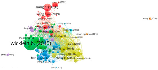 To obtain information on the most cited authors and top cited organizations, under the publication source category, “Bibliographic coupling” was chosen as the “analysis type,” and “authors” was chosen as the “analysis unit”. A researcher’s influence in an area is measured by the number of citations according to their names [43]. It has been established that the knowledge base of a field is the set of articles most cited by current research—also known as the intellectual base [42]. An author’s minimum number of documents was set at two, and 270 of the 847 authors met this condition as shown in Figure 5a, in 12 varying clusters. From the analysis, the powerhouse connecting items are Wang X., Zhang X., Wang J., and Zhang L., serving as the bridge to the other authors in the research domain. Being the most cited authors as shown by the size of the node in Figure 5a can be an indication of several factors, including the quality, originality, and significance of their research contributions. It suggests that their work has made a notable impact on the scholarly community and is often considered influential in this field.