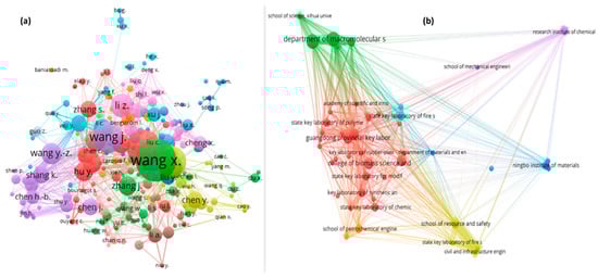 A researcher’s influence in an area is measured by the number of citations according to their names [43,44]. To obtain a better-defined picture, the study of the number of articles per author needs to be integrated with other types of analysis, such as citations, co-authorship, or network visualization. The research question intends to reveal the knowledge base of sustainable fire-resistant polysaccharides through the identification of key authors. The minimum number of documents for an author was set to two and 270 of the 847 total authors met the requirement (see Table 4 for top ten influencers). The full table can be found in Table S6), with 263 authors largely connected. The connecting network is between Zhang L., Zang X., and Wang X, bridging all other authors together as shown in Figure 8a, into fifteen (15) different cluster units. The total number of citations was divided by each author’s total number of publications (documents) in attaining the mean citation count per paper. In terms of co-citation, an author’s minimum citation count was set at 50, and 145 of the 15,276 authors met this requirement (refer to Figure 8b). The visualization is categorized into four clusters, thus; cluster 1 (red) comprising 70 items, cluster 2 (green) with 34 items, cluster 3 (blue) has 32 items, and cluster 4 (yellow) also has 9 items. From the VOSviewer translation, it is apparent that over the last two decades, co-authors, Schiraldi D.A. have been cited the most with 363 citations, followed by Wang X. with 345 citations, Zhang X. ranking third with 339 citations to his name, Hu Y. and Wang Y. ranking fourth and fifth, respectively, with 294 and 280 citations each. These stronger links indicate a higher level of collaboration and interaction between researchers within the scientific community as it provides insights into collaborative networks, research clusters, and research communities within the scientific domain. The stronger links are an indication of knowledge sharing and accelerated scientific progress, which resulted in impactful research outcomes. Additionally, collaborative efforts could result in increased visibility and recognition for individual authors and their institutions.