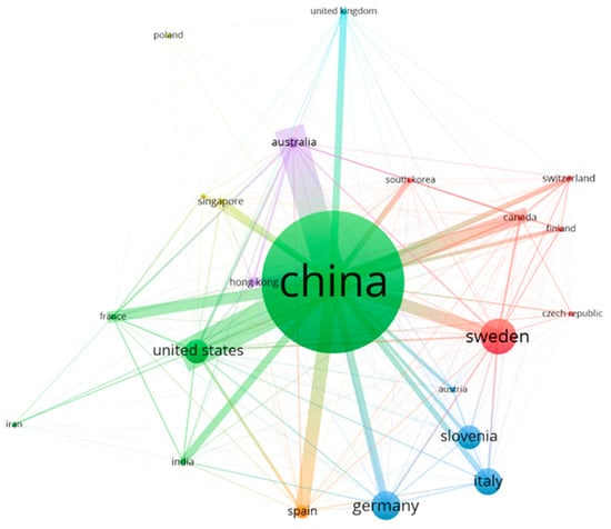 Network visualization of countries indicating their involvement in the relevant field of study.