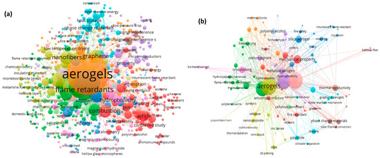 Keywords are important research metrics because they identify and represent the research domain’s fundamental field [43]. For this analysis, “co-occurrence” was chosen as the “kind of analysis,” and “index keywords” was chosen as the “unit of analysis” in VOSviewer. The minimum number of repetitions for an indexed keyword was set to two, and 603 of the 1975 keywords met the requirement (see Figure 7a and the top ten indexed keywords in Table 3). In the case of connecting links to the index keywords, the network visualization in VOSviewer provided visuals on the interconnectivity (see Figure 7b) of the used keywords in varying colors grouped into clusters of 14 namely cluster 1 red (77 items), cluster 2 green (75 items), cluster 3 blue (53 items), cluster 4 yellow (53), cluster 5 (purple) consists of 51 items, cluster 6 (sea blue) has 48 items, cluster 7 (orange) has 44 items, cluster 8 (wine) has 41 items, cluster 9 (pale purple) has 40 items, cluster 10 (tinted red) has 38 items, cluster 11 (yellow) has 31 items, cluster 12 (light blue) comprises of 25 items, cluster 13 (light yellow) consists of 24 items and cluster 14 (light purple) has 18 items. It is worthy of mention that on the premise of link strength, it is evident that within the scope of the study, the emphasis of researchers has been on aerogels and their flame and fire-retardant abilities. It is not surprising that aerogels, flame retardant, and flame retardancy have the largest nodes across the last two decades as can be seen from Figure 7a,b. The most frequently occurring keyword indicates the dominant research theme or topic within the field and reflects the primary area of interest and focus among researchers in sustainable fire-resistant polysaccharide-based composite aerogels. This also suggests that the topic is of significant interest to the scientific community and shows its particular relevance in these times. The associated big nodes could also indicate an emerging trend within the field which may reflect new research directions, technologies, or methodologies gaining traction among researchers. Generally, comparing the most repeated indexed keywords to the least repeated ones in VOSviewer analysis provides a comprehensive view of the research landscape. It offers valuable information about the dominant research areas, potential collaborations, emerging trends, and knowledge gaps, guiding researchers in navigating the literature and identifying research opportunities within their domain of interest.