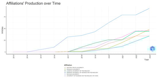 To understand trends in top cited institutions and appreciate the highest contributing institution to the body of knowledge over the years, biblioshiny was used based on the data obtained from Scopus. As presented in Figure 12, it is evident that over the past 18 years, Central South University has been the frontrunner in the relevant field of study, followed closely by Donghua University, Lanzhou University of Technology, Qingdao University of Science and Technology, Sichuan University and the University of Science and Technology of China, all serving as notable institutions in driving forward the future of research in sustainable polysaccharide-based composites.