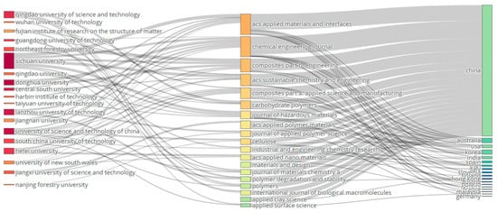 Three-fields plot analysis was conducted using biblioshiny to investigate the interconnections between journals, top authors, and countries. The interaction between top institutions (left), journals (middle), and countries (right) are illustrated in a three-field plot (Figure 13). The visualization demonstrates that most publications for aerogels and flame retardants originate from China and are mostly published in the top four journals in this field, namely, ACS Applied Materials and Interfaces, Chemical Engineering Journal, ACS Sustainable Chemistry and Engineering, and Composites Part B: Engineering. Again, the three top authors in this field are Chen Y., Zhang L., and Liu Y., with the majority of these publications coming from China, illustrating their lead in this field. The topmost institutions in sustainable fire-retardant polysaccharide-based aerogels are Qingdao University of Science and Technology, Huazhong University of Science and Technology, and the Wuhan University of Technology. On the country level, it is obvious that China, Australia, and the United States of America are the leading countries with a majority of these publications coming from China. It is fair to conclude that China is the powerhouse of research in Asia and globally in sustainable fire-resistant polysaccharide-based aerogels.