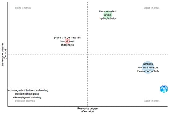 In the keyword thematic map (Figure 14), the keywords “aerogel, thermal insulation, and thermal conductivity” are placed in the lower-right quadrant representing a basic theme that has a high centrality and low density and is considered important and not yet developed for the research field. Similarly, “phase change materials, heat storage, and phosphorus” are niche themes with high density and low centrality, considered as well-researched with marginal importance in the study area. In the upper-right quadrant are the motor themes with high centrality and density, considered well-researched and important. In this quadrant, are “flame retardant, article, and hydrophobicity” representing the authors’ attribution and which are believed to have evolved from the basic themes.