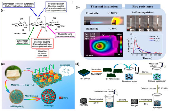 (a) Functional groups in chitosan structure [80] (b) Results of fire-resistance chitosan/montmorillonite/carbon [81] (c) Fabrication of magnesium-coated chitosan aerogel with HGM component [75] (d) Fabrication process of form-stable phase change material (PCM) composites (PBPCMs) [58].