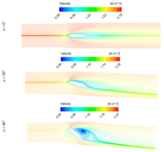 As the wind speed increases toward 2 m/s (see Figure 6), no significant disturbances are observed at angles of attack of up to 20°. However, at a steep orientation with α = 40°, a dominant vortex is formed downstream of the elliptical object. The mentioned vortex has direct impacts on the lift and drag coefficients, which will be discussed in the following subsections of this paper.