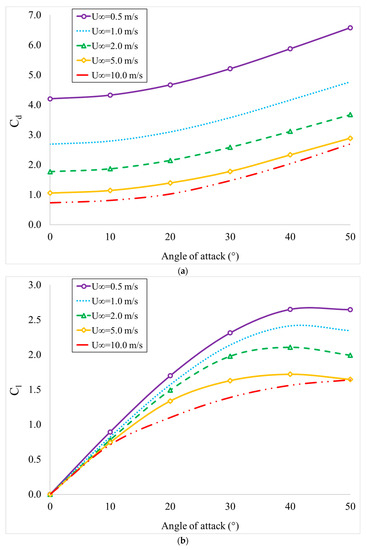 To determine the actuating force component in the direction normal to the flow direction, the transverse galloping phenomena was utilized. The galloping force () was related to the fluid dynamic pressure, and the instantaneous fluid force coefficient in the transverse direction was related to the flow stream (). As the time scale of the body oscillations was considerably higher than the flow field characteristic time scale, it was completely reasonable to apply the quasi-steady assumption. As the fluid force coefficient could be related to the lift and drag coefficient at each angle of attack, as it was expressed in Equation (6), the following formulation could be applied to estimate the force coefficient as a function of the angle of attack ().