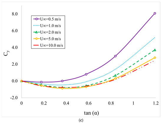 The variations in lift and drag coefficients are illustrated in Figure 9 for several wind speeds and angles of attack. The wind speed varies between 0.5 and 10 m/s, while the elliptical body is oriented based on angles of attack ranging from 0 to 50° to represent a wide range of oscillatory performances. Regarding the behavior of the drag coefficient, it is obvious that the drag force is non-linearly increased with the angle of attack (Figure 9a). At lower angle of attack, the drag force growth is lower than the same parameter at steeper orientations. Moreover, at each angle of attack the drag coefficient is increased toward lower velocity magnitudes. In other words, at a specific angle of attack of 20°, the drag coefficient is increased by 353% due to wind speed reduction from 10 to 0.5 m/s. It should also be added that the drag coefficient is more sensitive to the angle of attack at higher wind speeds. As the angle of attack varies from 0 to 50, Cd is increased by 56.6% and 268.1% for wind speeds of 0.5 m/s and 10 m/s, respectively. Focusing on the Cl chart, it is observed that at lower angle of attacks, a monotonic increasing behavior is achieved, while beyond an angle of attack of 20°, the increase rate of Cl versus α is reduced toward a maximum magnitude (Figure 9b). The lift coefficient decreases beyond the maximum value at a 30 to 40° angle of attack. Cl is independent of the wind speed for very low angles of attack (i.e., 0 to 10°), while at higher wind speeds, a considerable difference is observed for various wind speeds. Decreasing the wind speed from 10 to 0.5 m/s enhances the Cl by 61.2% at a 50° orientation of the elliptical body. The reported trend for drag and lift coefficient is close to those of the available literature for this body in wind streams, as the cross-sectional aspect ratio of the examined body represents a nearly thin body. The component of fluid force in the transverse direction (Cy) is illustrated in Figure 9c. This graph is provided as a function of tan(α), which is to be used for the calculation of a1 and a3 parameters in Equation (1). At large angles of attack, a monotonic increasing trend is observed as a function of tan(α), while at initial stages of elliptical body rotation, a more complicated behavior is occurred. For the minimum simulated wind speed, Cy remains unchanged near a value of zero up to tan(α) = 0.4, while a rapid increase occurs beyond that value. However, for higher values of wind speed, a slight reduction, followed by rapid increase, is observed as a function of tan(α). To be more specific, except for U∞ = 0.5 m/s, a minimum value of Cy is distinguishable between tan(α) values of 0.4 and 0.6.