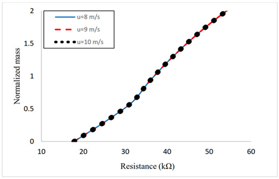 The effect of wind speed on output power at different tip masses is presented in Figure 15. As expected, increasing the wind speed and normalized mass increases the output power, though for higher normalized mass, the power increment is decreased. Additionally, Figure 14 reveals that the wind speed has no effect on the tip mass–resistance relationship.
