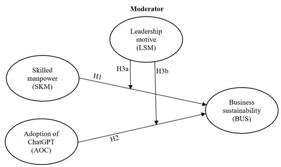 Organizations using ChatGPT also need to incorporate sustainable conditions [10]. It is worth mentioning that sustainability in organizations refers to their strategizing and planning to effectively reduce the environmental impacts resulting from their business operations [1]. The practices of organizations are typically analyzed and evaluated against environmental, social, and governance metrices. Organizations need to realize that, for sustainability, it is not enough to act on environment-related issues only, but they also need to ensure society’s long-term well-being. Organizations can also be financially more sustainable if their employees are skilled at using modern technologies such as chatbot tools [11,12,13]. Organizations might derive sustainable benefits from using ChatGPT, and to extract the best potential from this platform, the leadership of the organizations must be supportive of adopting ChatGPT applications [14]. ChatGPT helps organizations to meet their sustainability goals. From small ventures to large corporations, ChatGPT can guide businesses on their sustainability journey and drive positive change. Using ChatGPT, businesses can achieve their sustainable goals. ChatGPT can be linked as a sustainability advisor for businesses of various sizes [2,12,14]. Retailers can use AI-driven ChatGPT to optimize energy usage in stores and reduce transport emissions when delivering products [4,5]. However, researchers are still not clear on how organizations that adopt ChatGPT could enhance their sustainability performance and what kind of skills their employees are required to have to efficiently use it. Also, studies are scant to understand the role of leadership in facilitating an organization to adopt ChatGPT. In this vein, the present study aims to address the following research questions (RQs).