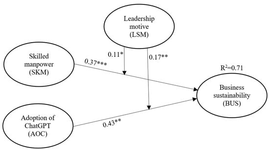 Leadership motivation (LSM) positively moderates the relationship between adoption of ChatGPT (AOC) and business sustainability (BUS).