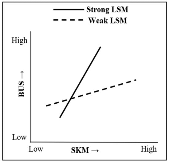 The present study has also demonstrated that leadership motivation facilitates sustainable business growth by positively impacting the relationships between that and its two predictors: skilled employees and ChatGPT adoption. As discussed in Section 5.3, MGA analysis found the moderator effects of leadership motivation on H1 and H2 to be significant. Here, the moderating effects of leadership motivation (LSM) on the linkages SKM→BUS (H1) and AOC→BUS (H2) will be discussed through a simple slope analysis that compares the effects of Strong LSM and Weak LSM on the relationships. This analysis is illustrated in Figure 3 and Figure 4.