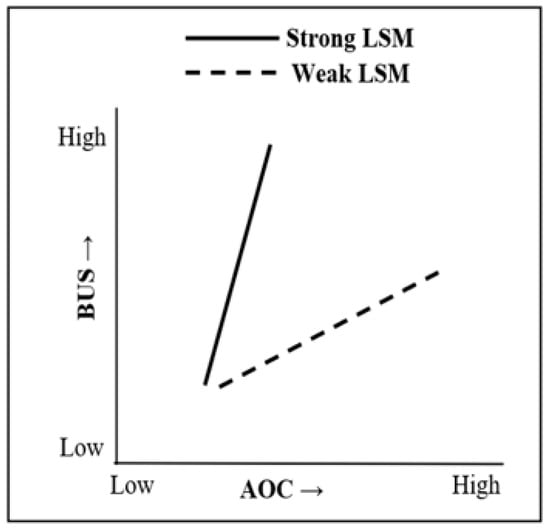 In the two graphs (Figure 3 and Figure 4), the continuous lines represent the effects of Strong LSM on H1 and H2, whereas the dotted lines represent the effects of Weak LSM on H1 and H2. We can observe from the slopes of the two graphs that as the SKM (Figure 3) and AOC (Figure 4) increase, Strong LSM has a greater effect than Weak LSM on the rates of increase of BUS since, in both the graphs, the slopes of the continuous lines are more than the slopes of the dotted lines.