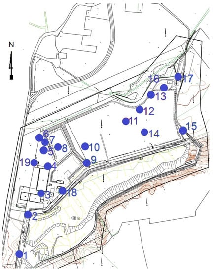 The field studies were carried out in 19 control areas (see Figure 1), each measuring approximately 10 m × 10 m. These areas are located at technological points throughout the landfill (e.g., the composting plant), where there is a high probability of odour problems.