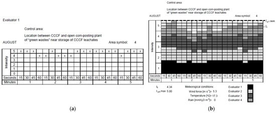 Individual scorecard for the assessment of the odour intensity (evaluator 1, area 4, August) (a); summary scorecard for measurement, performed in August, of odour intensity for control area number 4 (four evaluators, five minutes, four tests per minute) (b).