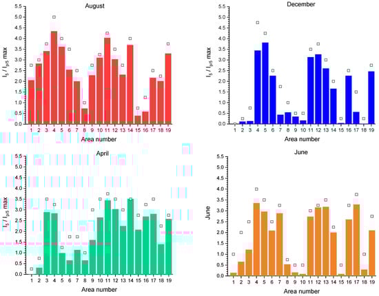 The calculated intensity values for the five-minute period (I5) and the maximum temporary intensity (Ip/5max) for all investigated areas measured in August, December, April, and June are presented in Figure 3, and the meteorological conditions and values of the calculated odour concentrations are presented in Table 1. The highest temperatures were recorded in June (between 21 °C and 23 °C), then in August (from 16.2 °C to 18.2 °C); temperatures were average in April (from 12 °C to 15 °C), and the coldest month was December (from −4.6 °C to −5.2 °C). The measured temperatures reflect seasonality, which has also been observed by others [].