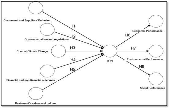 In the context of the association between SFPs and economic performance, research suggests that implementing sustainable practices can have a considerable positive effect on restaurants’ financial performance. As a cost–benefit analysis, SFPs can substantially affect a restaurant’s economic performance by reducing operating costs [31,51]. For instance, by implementing SFPs, restaurants may optimize their use of resources, such as energy, water, and food, which can lead to significant cost savings. In addition, reducing food waste through sustainable practices can save money on disposal fees and lower the cost of ingredients. Additionally, efficient energy and water use can reduce utility bills and minimize the impact of price fluctuations on these resources [52,53]. SFPs may also positively affect a restaurant’s sales and overall performance. By offering sustainable food options, restaurants may attract a growing number of customers looking for eco-friendly choices [54,55]. Recently, the demand for sustainable food options has grown significantly, and more customers are willing to pay a premium for sustainable food [56,57,58]. SFPs can also help enhance a restaurant’s brand image, leading to increased loyalty and customer retention [59,60]. In conclusion, by prioritizing SFPs, restaurant owners and managers can ensure their businesses’ long-term success and economic sustainability. Hence, it could be assumed that: