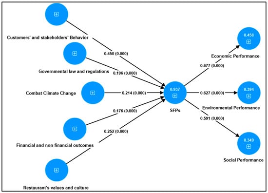 The current research proposed a path model for testing various hypotheses that explore the influence of multiple factors on the promotion of SFPs in restaurants across Saudi Arabia. These factors include customers’ and stakeholders’ sustainable behaviors, governmental laws and regulations around sustainability, restaurants’ commitment to combat climate change, the financial and non-financial outcomes of adopting SFPs, restaurants’ values and culture toward sustainability and, further, to empirically examine the effect of promoting SFPs on restaurants’ economic, environmental, and social performance. To validate this study’s hypotheses, the researchers utilized the power of the PLS-SEM algorithm and bootstrapping on a subset of 5000 samples. This unique approach helped evaluate the path coefficient and establish the significance of correlations among constructs, as outlined in Table 7 and Figure 2.
