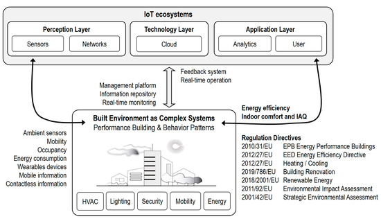 Buildings do not exist in isolation but rather are interconnected at various scales and levels (neighborhood, city, region, etc.), forming communities. Information flows and knowledge is shared at these interconnected levels. Therefore IoT-based initiatives are mandatory to develop transversal strategies as emphasized in EPBD [7]: “… promotion of smart technologies and infrastructure for sustainable mobility in buildings,” and “… integration of smart charging services enable[s] the energy system integration of buildings”. In this context, it is essential to understand the relationships between buildings and their communities (urban and rural, cities and villages, etc.) conforming to the built environment (see Figure 1) that also constitute complex systems understood as interconnections of buildings used by many people, who are themselves also interconnected with each other and with the environmental context. As remarked in EPBD [7], “In order to digitalize the building sector, the Union’s connectivity targets and ambitions for the deployment of high-capacity communication networks are important for smart homes and well-connected communities”.