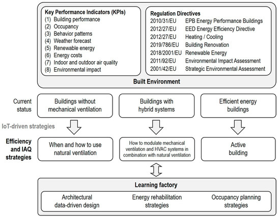 As detailed in Section 4, an entire university campus (with 3 buildings of 14,000 m2 for 1000 students and 250 staff, 21,000 m2 for 1500 students and 350 staff, and 27,000 m2 for 2000 students and 450 staff) was used as the IoT learning factory. As Figure 3 shows, it is essential to understand the current status of the built environment, which typically can be classified into one of the following three general types of buildings (not only university buildings) according to ventilation and energy efficiency: