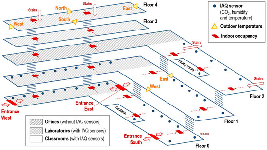- Select representative spaces to monitor. As detailed in Section 3, the monitoring spaces were selected and labelled according to their key characteristics, such as their location (floor, building, campus), orientation (north, south, east, west), use (classroom, study room, office, laboratory, library, canteen, etc.), size (large, medium, small), occupancy (high, medium, low), etc. As a representative example, Figure 4 shows all the ambient sensors deployed in Building I of Campus Río Ebro.
