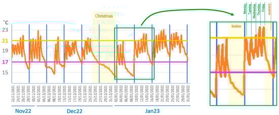 First, focused on energy efficiency analysis, Figure 5 and Figure 6 illustrate several lessons learned about energy consumption, costs, and savings. As a representative example, Figure 5 shows the average temperature evolution each day of the week in a building of Campus Río Ebro (Building I). The measurements (graphic in orange color) are the result of averaging the daily temperature measurements of every monitoring space in Building I during the fall semester (Figure 6 details December 2022 and January 2023). As in Spain, following Order PCM/466/2022 [69] for buildings of the General State Administration and institutional public sector entities, public buildings with associated HVAC energy consumption must keep the indoor temperature (when heating) between 17 and 21 °C; these thresholds are marked in Figure 5 with a pink line (for 17 °C) and a orange line (for 21 °C). Every week is delimited between the vertical blue lines, and every day can be identified by its maximum (peak) temperature value: a zoom is detailed (framed in green color), where every peak is underlined as Monday, Tuesday, etc., including the weekend (shaded in yellow color). Thus, Figure 5 highlights two interesting features: