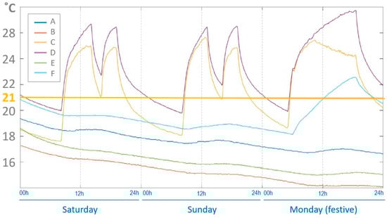 To deeply analyze some of these trends, Figure 6 shows (as a zoom) the detail of the daily temperatures of various monitored spaces in this building, specifically, six classrooms on the second floor with the same characteristics: capacity for 70 people (medium size) with medium occupancy and north orientation. The measurements (graphics in different colors for every classroom from A to F) are the instant temperature over three days (Saturday, Sunday, and a holiday Monday). Figure 6 shows that several classrooms (D, C, and F) follow anomalous trends since their temperatures reach very high values when the heating system should be disconnected. Thanks to the IoT ecosystem reporting this building performance, the energy management system was queried, and it was found that the thermostats in those classrooms (C in orange and D in purple) were not working correctly. Thus, the HVAC system was active all weekend. In addition, classroom F (in blue) was not marked in the energy management system as a holiday, so the HVAC system started on Monday as if it were a conventional week.