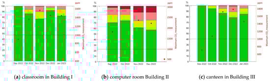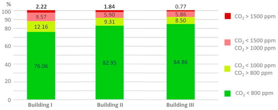 Second, focused on IAQ analysis, Figure 7 and Figure 8 show several lessons learned about the improvement of healthy environments. Figure 7 shows the average CO2 levels (in percentages; see the left axis) of every building in Campus Río Ebro (Buildings I, II, and III). These average CO2 levels are the result of averaging the daily CO2 measurements of every monitoring space in each building during the fall semester (from September 2022 to January 2023). The average values show in all cases how CO2 levels meet the recommended levels (CO2 < 1000 ppm (in light green) under usual conditions, with CO2 < 800 ppm (in dark green) to minimize the COVID-19 risk) around 90% of the time: 88.22% in Building I, 92.26% in Building II, and 93.36% in Building III.