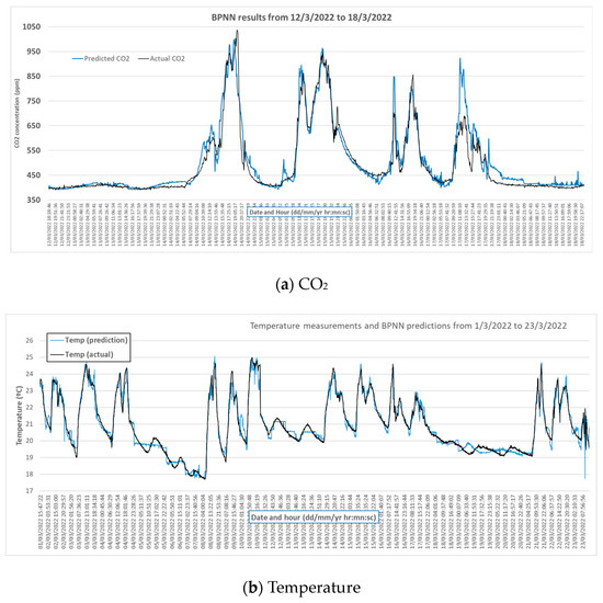 Figure 9 shows the results obtained by applying the neural network to the data measured during the month of March, obtaining a regression value of R2 = 0.996 and a Mean Squared Error (MSE) of 535 for CO2 and 0.219 for temperature. This high degree of correlation confirms the usefulness of the BPNN as a promising strategy for making this type of prediction if the sample size is sufficiently large. The precision of the prediction (±23.13 ppm) is less than that of the CO2 sensors, which is ±40 ppm. Similar results can be found for temperature, where a precision of ±0.46 °C is like ±0.45 °C of the sensor precision. The predicted values (indicated by the blue line) fit the measured values (indicated by the black line) remarkably well. The neural network obtained is already available for use in the IoT ecosystem as a prediction tool for CO2 levels and temperature. To further increase the level of accuracy, additional experimental data could be obtained throughout the entire year. Furthermore, variables such as humidity, HVAC system operation, indoor activity, windows opening, wind incidence, and other external climatic characteristics should be included to increase the correlation between sensor data and predictions or the time horizon of the prediction. Given the demonstrated usefulness of the BPNN, additional experiments should be carried out to extend the methodology to other kinds of spaces.