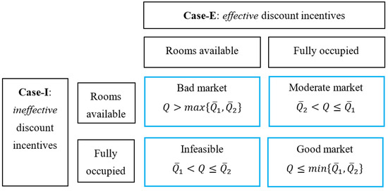Table 5 indicates that the room occupancy rates in Case-FE and Case-PE are always higher than in Case-I when the market is bad or moderate. This is because, once the discount is higher than the sacrifice value perceived by customers, this discount incentive is effective and can help to attract more customers to check into the hotel (see Equations (6) and (9)) if there are available rooms. Therefore, discount incentives promote green customer behavior and help to increase room occupancy when the hotel is not full.