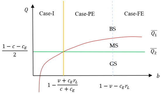 As for Case-E is optimal (Table 2), the green hotel does not provide a discount incentive for . Here, is the total cost saved due to carbon reduction, while is the total cost before carbon reduction. Hence, represents the proportion of the cost saved by the hotel owing to carbon reduction, and thus (i.e., ) is the proportion of the actual consumption cost. Moreover, as and are generally different (i.e., if and only if ), there are three mutually exclusive situations, as shown in Figure 1. In a “bad market situation” (BS), the hotel is not full in both Case-E and Case-I. In a “good market situation” (GS), the hotel is fully occupied in both Case-E and Case-I. In a “moderate market situation” (MS), the hotel is not full in Case-I, while it could be fully occupied in Case-E.