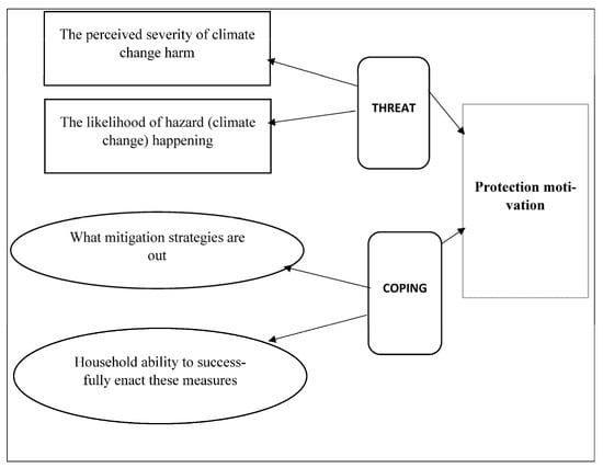 The protection motivation theory (PMT) is a framework, which comprises threat and coping assessments as multidimensional determinants of motivation. The study is built around the PMT with the main aim of assisting households and farmers in responding to climate change threats on food security and agricultural productivity, as well as motivating households to respond to threats by adapting to climate change issues. This theory was developed by Rodgers in 1975 with the main aim of providing some assistance for households and individuals in response to climate change crises, thereby motivating them to marshal-out mitigation strategies. The PMT theory provides insight into the variables affecting a household’s incentive to respond to perceived risks from climate change. The objective of PMT acknowledges and evaluates the threat posed by climate change, and then respond to the evaluation with effective and efficient mitigation. The idea underlying PMT’s assertion is that families are more likely to respond and adapt to risk-reducing situations in order to protect themselves from crisis situations such as climate change [34]. According to the threat and coping appraisal theories of protection motivation, households defend themselves against risk-mitigating issues. To a large extent, the agriculture sector is threatened by climate change, which must be addressed through adaptative measures. PMT was found to be a suitable model to guide studies on climate change.