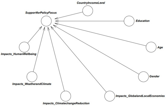 In the current study, we employed nine variables to construct the model (one outcome and eight predictor variables). The outcome variable is SupportforPolicyFocus, representing the respondents’ support for marine and coastal ecosystem enhancement and preservation to be centered on policies addressing climate change, nature conservation, and sustainable development. Three predictor variables demonstrating respondents’ socio-demographic factors were included to address the first research objective: Age, Gender, and Education. For the second research objective, we included the variable CountryIncomeLevel into the model to examine whether stakeholders from countries with distinct income levels also had different perceptions. We based our calculations on the United Nations classifications of countries by income level to generate the variable with four levels [47]: ‘low-income country,’ ‘lower-middle-income country,’ ‘upper-middle-income country,’ and ‘high-income country.’ Impacts_HumanWellbeing, Impacts_WeatherandClimate, Impacts_ClimatechangeReduction, and Impacts_GlobalandLocalEconomies variables were also included to fulfill the third research objective. They reflect the degree to which stakeholders thought marine and coastal ecosystems would majorly influence human wellbeing, weather and climate, climate change reduction, and global and local economies, respectively. Detailed descriptions of these variables are shown in Table 1.