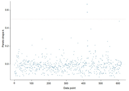The posterior distribution, denoted as is calculated through the data minus data point . The PSIS method was employed to compute leave-one-out cross-validation k-Pareto values (using the R loo package). Observations with k-Pareto values greater than 0.7 are normally regarded as influential for checking the model’s goodness-of-fit. It is typically regarded as being fit when a model’s k values are less than 0.5.