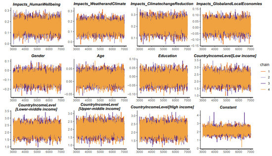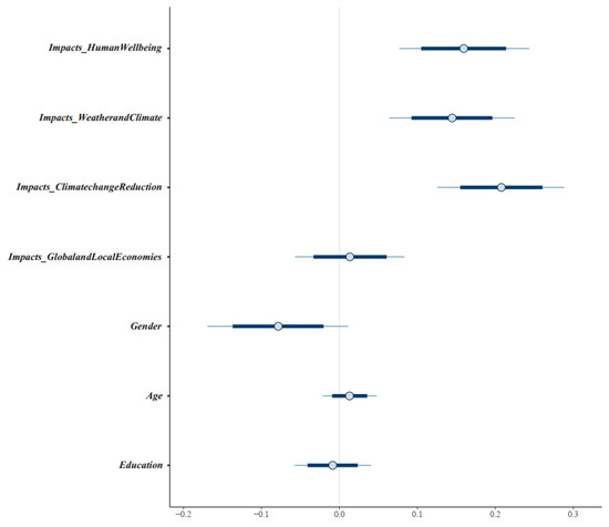 The simulated results manifest the positive associations between , , , and . Meanwhile, has an ambiguous effect on ( = 0.01 and = 0.04). Regarding the socio-demographic factors, only gender is found to affect stakeholders’ support for the policy centered on marine and coastal ecosystem enhancement and preservation ( = −0.08 and = 0.05). Specifically, female stakeholders tended to obtain higher support than their male counterparts. The effects of age and education on policy support are ambiguous ( = 0.01 and = 0.02; = −0.01 and = 0.03). The effects of , , , and are reliable as their posterior distributions are located entirely on the positive and negative sides of the x-axis (see Figure 4).