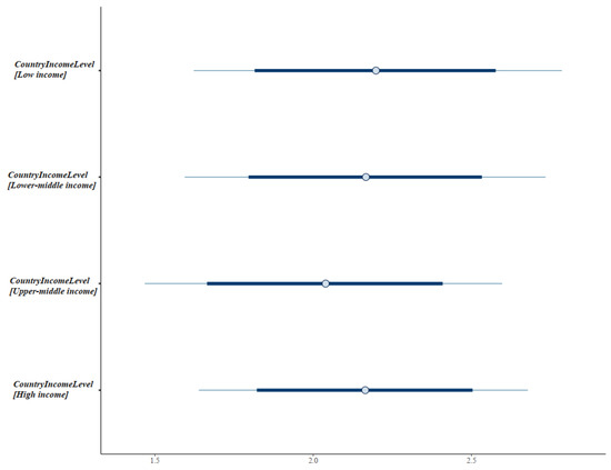 There are several advantages to employing BMF analytics in the current study. First, the Bayesian approach probabilistically considers all properties, including unknown parameters, enabling accurate prediction using parsimonious models [49,50]. Second, the Markov chain Monte Carlo technique allows for fitting complex models, such as polynomial, non-linear, and hierarchical regression structures [51]. Here, we employed hierarchical Bayesian regression (or Bayesian multilevel modeling) with being the varying intercepts for several reasons. Multilevel modeling helps improve the estimate of a dataset with unbalanced samples; few respondents are from low-income countries (5 observations, accounting for approximately 1%) and lower-middle-income countries (14 observations, accounting for approximately 2%) [52]. Multilevel modeling also explicitly provides estimates of variation among groups. Thus, this method is highly suitable for survey data, which are often non-random and limited [53]. Third, compared to the frequentist approach, Bayesian inference offers several advantages, such as the use of credible intervals and the highest probability of parameters instead of the dichotomous decision-making of accepting or rejecting a hypothesis based on p-values [54].