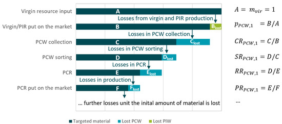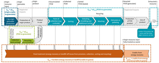 | Information needed | Production, collection, sorting, and recycling rates of PIW and PCW | Recycled and reused content, recycling efficiency for recycled feedstock provision and for destination after use; lifespan, utility, and material fraction for reuse and recycling after use | eC and the environmental impacts associated with the material (virgin provision, PIR and PCR, and EoL) | Avoided impacts of the virgin production (material or energy), percentage of substitutable virgin material, recycling rate, environmental impact of the recycling process |