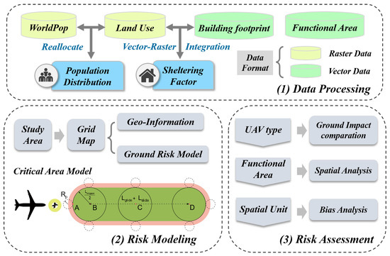 The applications of geospatial big data have gained tremendous popularity in recent years, thereby providing new opportunities to produce accurate gridded population and urban land use datasets at finer spatial resolutions [28,29]. Many high-quality population datasets have been produced and are available in finer spatial detail [30], such as Gridded Population of the World (GPW) [31], LandScan [32], and WorldPop [33]. To fill the deficiency of fine-scale urban PER analysis of UAV operations, this research utilized grid-based risk maps combined with the high resolution of population and land use details to (1) assess the ground impact of two types of UAVs, (2) explore the PER distribution pattern characteristics and reveal the high PER hotspot from the perspective of functional areas, and (3) explore the risk and disparities based on different spatial units. The framework of this study is shown in Figure 1. The research contributes to existing literature by expanding the application of multisource geospatial data in UAS risk assessment and management research, and its novelty is that it expands the literature by providing a high-resolution quantitative model to assess the exposure risk of UAV operations based on a combination of the GIS and ground risk models. The findings offer potential implications for urban air mobility management and facilitating the large-scale adoption of UAVs.
