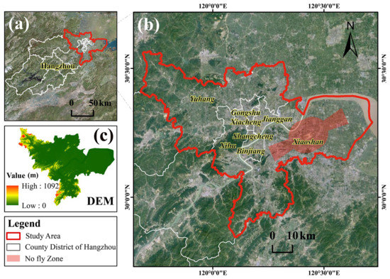 Location and environment of Hangzhou and study area. (a) Location of the study area (red-line boundary) in Hangzhou (white-line boundary). (b) Map of county administrative units in the study area, with no-fly zones as red polygons. (c) shows the elevation of the study area.