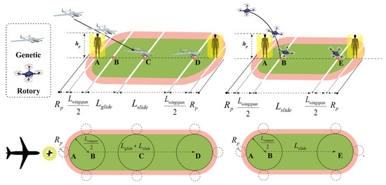 In Figure 5, the left and right sides correspond to the ground impact process for two types of UAVs. For the generic type, the length of the projection of its critical area in the horizontal plane consists of glide (where the aircraft is still airborne) and slide (where the aircraft is moving on the ground) distance. Moreover, due to the special aerodynamic properties of rotary UAVs, the glide distance will also be zero.