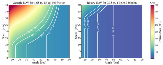 As depicted in Figure 6, the horizontal axis of the plots represents the impact angle and the vertical axis represents the velocity, with colors indicating the estimated impact area based on the model. Contours outlining typical critical areas are also added to the plot. A pattern is observed between the critical area and two factors—impact angle and velocity—for both experimental UAVs. As the impact angle increased, the effect of impact velocity on critical area decreased, as evidenced by the white contour line appearing to drop vertically when impact angle and velocity are small. This is due to an increase in impact angle, resulting in a decrease in horizontal velocity and a reduction in slide area, leading to the critical area being primarily influenced by the glide. The generic UAV, due to its greater weight and shape, had a larger critical area compared to the rotary UAV.