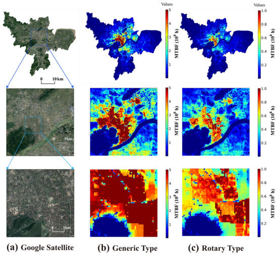 The spatial distribution of the minimum required mean time between failure (MTBF) for two types of UAVs at different scales of acceptable risk levels in urban areas of Hangzhou: (a) Google satellite data; (b) minimum required MTBF map of generic-type UAV; (c) minimum required MTBF map of rotary-type UAV.
