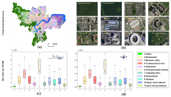 To further explore the characteristics of PER, we conducted an analysis to examine the differentiation of PER across different urban functional areas. It is important to note that we excluded airport facilities from our analysis, as they are designated as no-fly zones for UAVs. In Figure 8a,b, we present the different urban functional areas from a general and a local perspective, respectively. The “1-Other” functional area encompasses land cover types such as arable land, forest, grassland, scrub, wetland, water, and bare ground, excluding impervious surfaces. Figure 8c,d display the PER box line diagrams for the two types of UAVs in the different urban functional areas, with the solid lines in the boxes representing the 25th percentile, median, and 75th percentile.