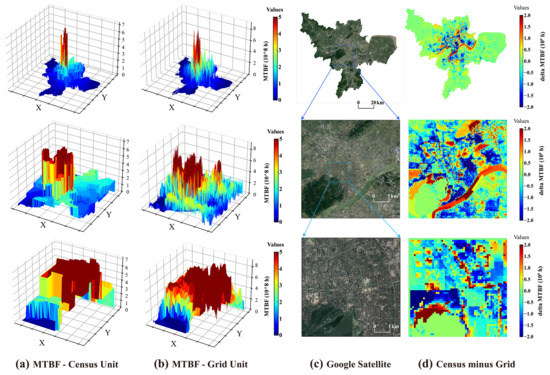 Due to the inherent difficulties in quantifying failure rates of different UAV types operating in diverse regions, we adopted a substitution approach to assess the associated risks. Specifically, we employed a fixed acceptable safety level of 10−7 within our model and calculated the MTBF for each urban grid cell. A longer MTBF, indicating a lower required failure rate, implies a higher risk of population exposure in the area. This highlights the imperative for implementing more stringent UAV safety management measures in the region. Utilizing the relevant parameters, we computed the risk values for each grid cell within the study area, which were subsequently visualized geographically in Figure 7. To facilitate a more comprehensive comparison, we present the minimum acceptable MTBF for the two UAV categories from three different perspectives: city-wide, regional, and micro-regional. To ensure consistency in our descriptions, we refer to the average failure rate times at acceptable equivalent safety levels as the population exposure risk (PER) in the subsequent sections of this paper.